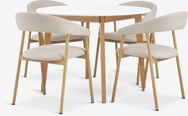 JEGIND + EJSINGJEGIND Ø105 Tisch weiß + 4 EJSING Stühle beige/Eiche natur