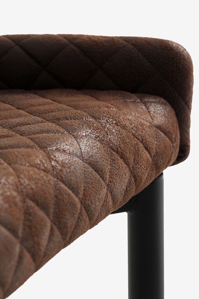 Esszimmerstuhl mit gepolstertem Sitz und Rückenlehne aus braunem Stoff im Antik-Look. Schwarze Beine aus Stahl.