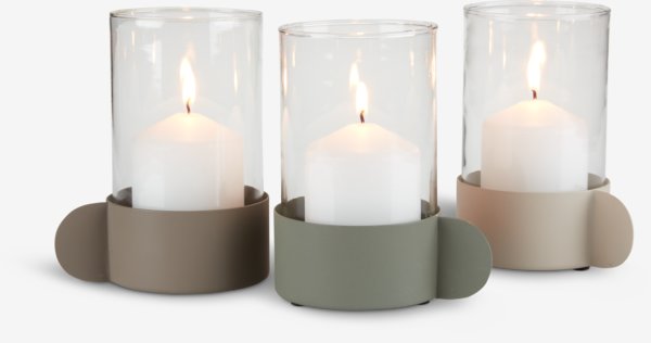 Kleine Glaslaterne mit einem pulverbeschichteten Stahlboden, erhältlich in verschiedenen Farben. Die Laterne ist für Stumpenkerzen geeignet und erzeugt ein warmes, einladendes Licht. Ideal, um sie auf den Gartentisch oder Loungetisch zu stellen und eine gemütliche Atmosphäre zu schaffen. Ø10 x H16 cm