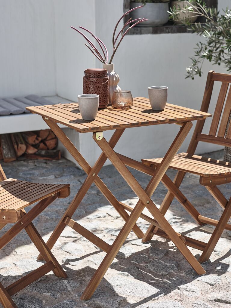 Bistrotisch aus geöltem FSC®-Hartholz. Der Tisch lässt sich flach zusammenklappen und leicht verstauen. Das langlebige Holz wird mit Öl behandelt, um es zu schützen und seine natürliche Farbe hervorzuheben. Um die Farbe weiterhin zu erhalten und es vor Feuchtigkeit zu schützen, empfiehlt sich ein regelmäßiges Ölen des Holzes. B62 x L62 x H74 cm