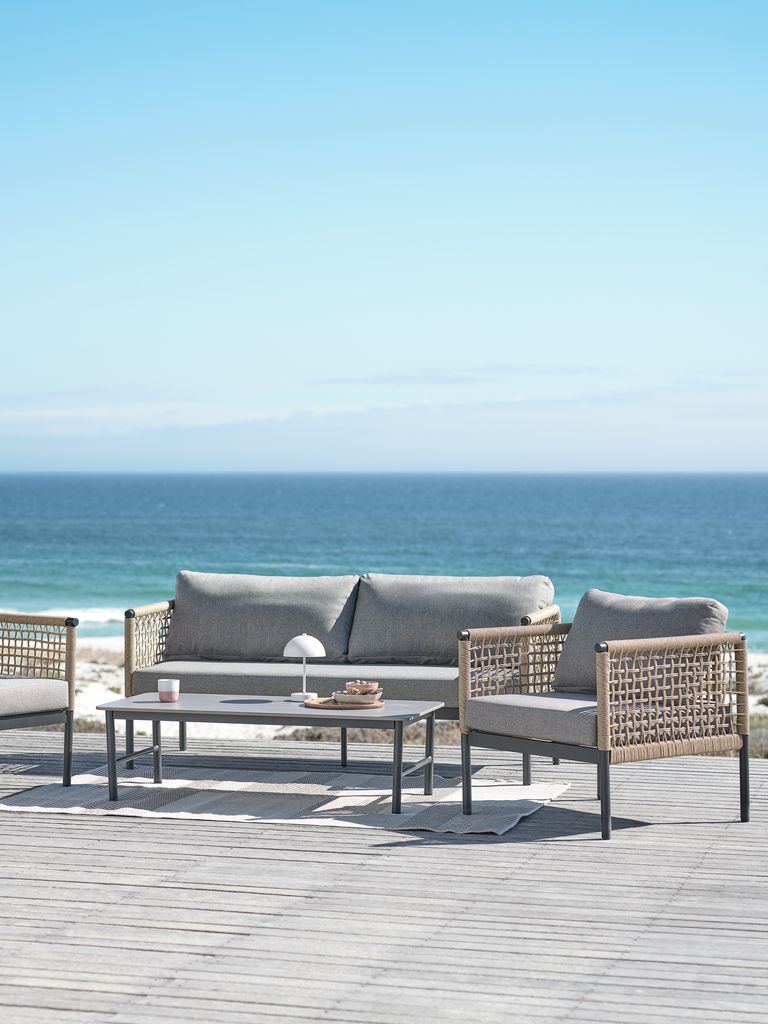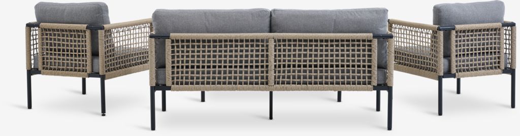 Lounge-settet var enkelt å montere, har et nett uttrykk og er en fryd å se på. Stolsetene er brede, slik at man komfortabelt kan trekke føttene «opp under seg». Bena har en skru-funksjon for utligning av høydeforskjell på underlaget. Det er en ekstra fot til midt under sofaen for ekstra støtte. Bordplaten er tung slik at det ikke då lett blir «tatt av vinden». Hele ensemblet er veldig solid og anbefales! Har en rund jutematte som passer veldig godt til.