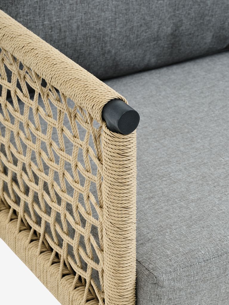 Das Sofa und die Stühle sind aus Polyrattan gefertigt. Polyrattan ist ein leichtes, synthetisches Korbgeflecht, das für ein natürliches Aussehen sorgt und gleichzeitig wetterbeständig und pflegeleicht ist.