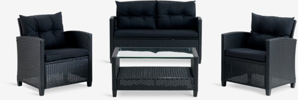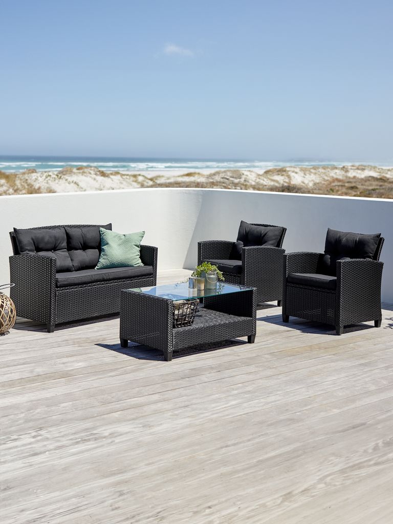 Schaffen dir mit dem MORA Lounge-Set einen gemütlichen und komfortablen Außenbereich. Dieses schwarze 4-Sitzer Set besteht aus einem Sofa und zwei Sesseln mit bequemen Kissen sowie einem passenden Loungetisch mit Tischplatte aus gehärtetem Glas.