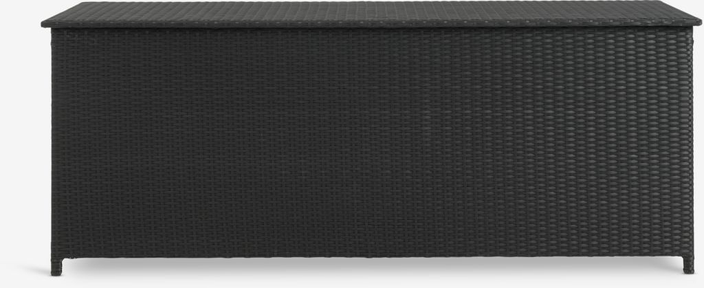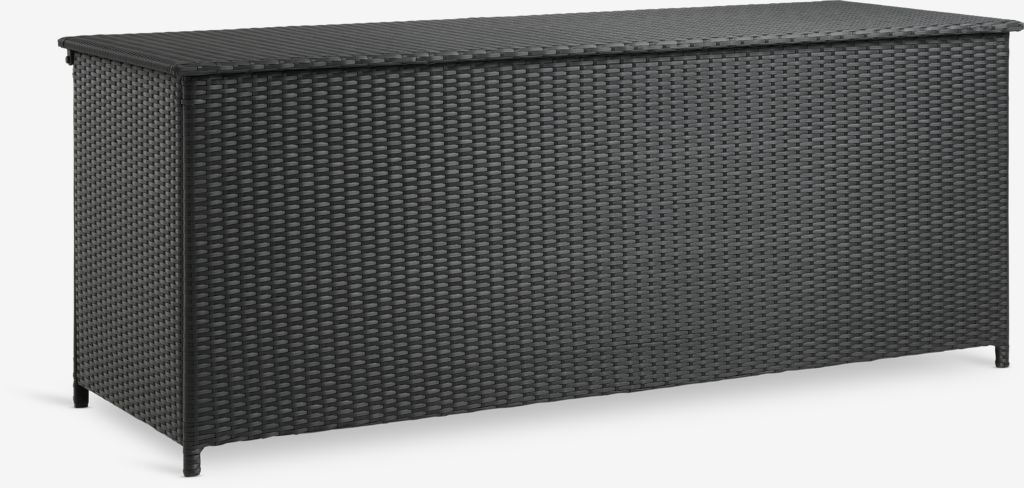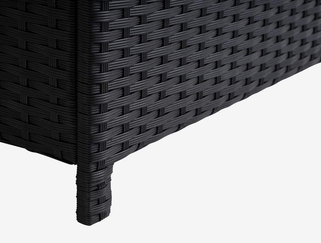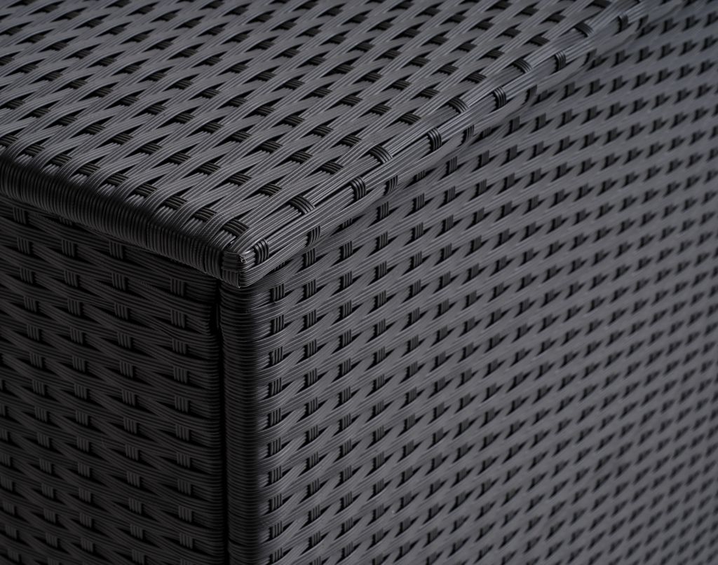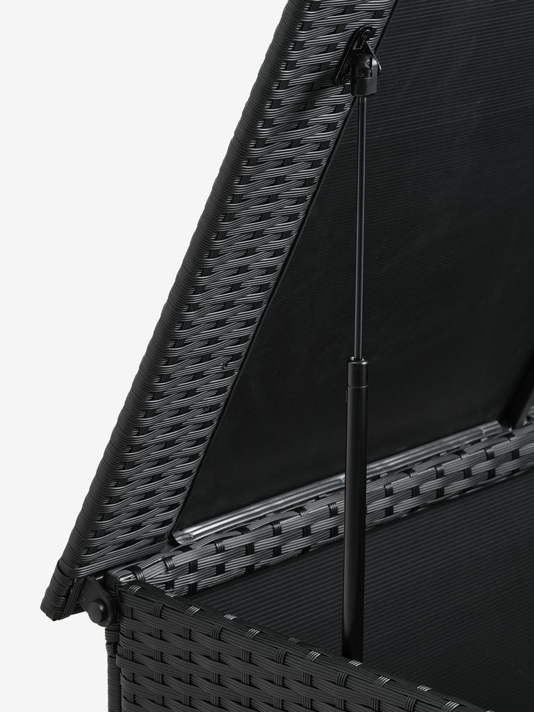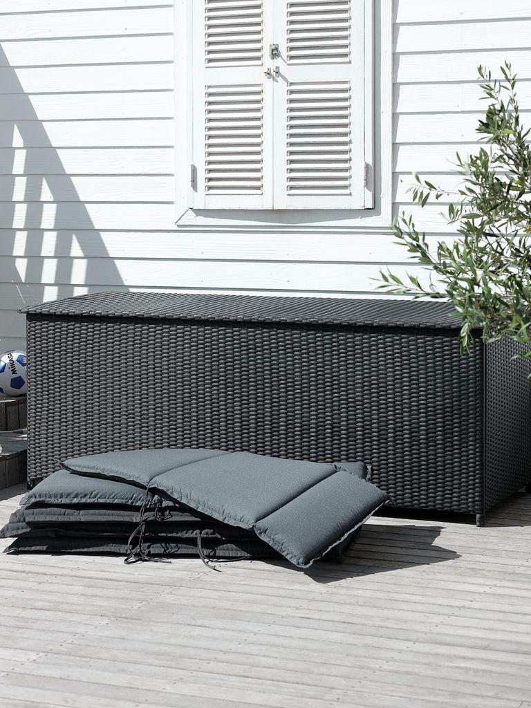 Auflagenbox aus Stahl, Polyrattan und Kunststoff. Mit einfach zu bedienendem hydraulischem Deckel. B197 x H76 x T71 cm