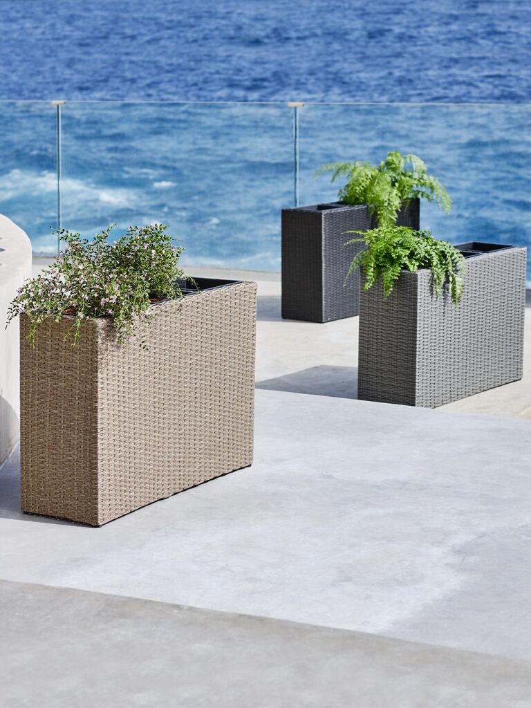 Grauer Pflanzkasten aus Polyrattan mit einem stabilen Stahlrahmen. Der Pflanzkasten hat 3 Fächer, mit der Möglichkeit, drei ähnliche oder unterschiedliche Pflanzen und Blumen zu pflanzen. Ein Ablaufloch kann leicht hergestellt werden, um sicherzustellen, dass überschüssiges Wasser abfließen kann. Der Pflanzkasten kann auch als Raumteiler verwendet werden. B30 x L83 x H60 cm