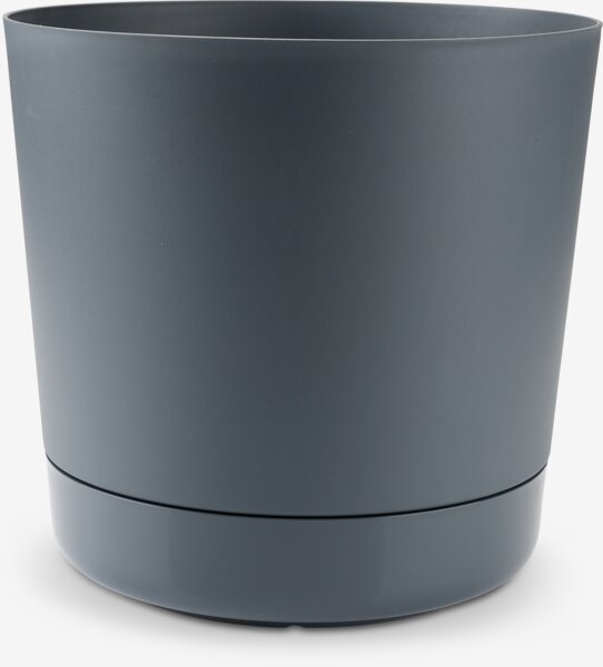 Pflanzkübel aus robustem, frostfestem Kunststoff (100% recycelt) in anthrazitgrauer Farbe. Er verfügt über einen integrierten Wasserspeicher, der die Pflanzenpflege erleichtert. Ø28 x H28 cm