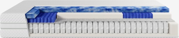 | Komfortzonen | Die Komfortzonen sind so konzipiert, dass sie verschiedene Körperbereiche wie Kopf, Schultern, Lendenwirbelbereich, Hüften und Beine besonders unterstützen. Die Zonen variieren in der Festigkeit, um zum Beispiel eine zusätzliche Lendenwirbelstütze oder eine tiefere Schulterzone zu bieten. Durch die gezielte Unterstützung in bestimmten Bereichen tragen die Komfortzonen dazu bei, den Gesamtkomfort zu erhöhen, eine gesunde Schlafposition zu fördern und Druckstellen zu reduzieren. |