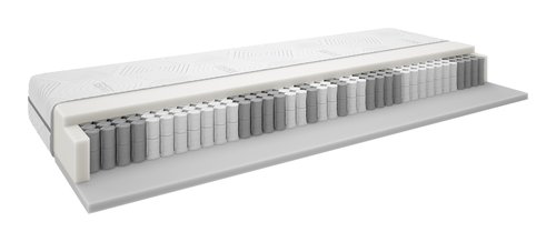 22 cm hohe, wendbare Federkernmatratze 90x200 cm mit 376 Multi-Taschenfedern/m², unterteilt in 7 Komfortzonen, die eine einzigartige, ergonomisch korrekte Unterstützung bieten. Die Matratze ist auf einer Seite mit HR-Schaum und auf der anderen Seite mit Polyätherschaum gepolstert. Waschbarer Bezug mit SensICE auf einer Seite, der einen sofortigen, wohltuenden Kühleffekt hat.