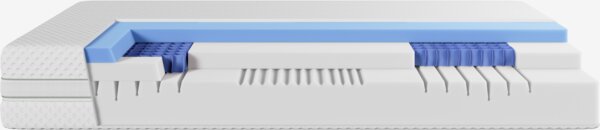 | Komfortzonen | Die Komfortzonen sind so konzipiert, dass sie verschiedene Körperbereiche wie Kopf, Schultern, Lendenwirbelbereich, Hüften und Beine besonders unterstützen. Die Zonen variieren in der Festigkeit, um zum Beispiel eine zusätzliche Lendenwirbelstütze oder eine tiefere Schulterzone zu bieten. Durch die gezielte Unterstützung in bestimmten Bereichen tragen die Komfortzonen dazu bei, den Gesamtkomfort zu erhöhen, eine gesunde Schlafposition zu fördern und Druckstellen zu reduzieren. |