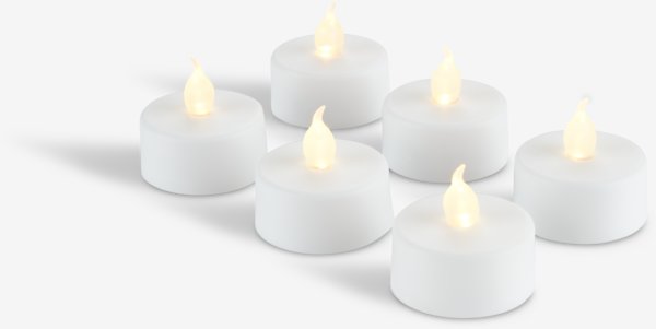 6er-Pack weiße LED-Teelichter mit warmem Leuchten. Diese batteriebetriebenen Teelichter verfügen über eine praktische Timerfunktion, die für 6 Stunden ein- und 18 Stunden ausgeschaltet bleibt. Ideal zur Schaffung einer gemütlichen Atmosphäre in jedem Innenraum. Batterien nicht enthalten. Ø4 x H4 cm
